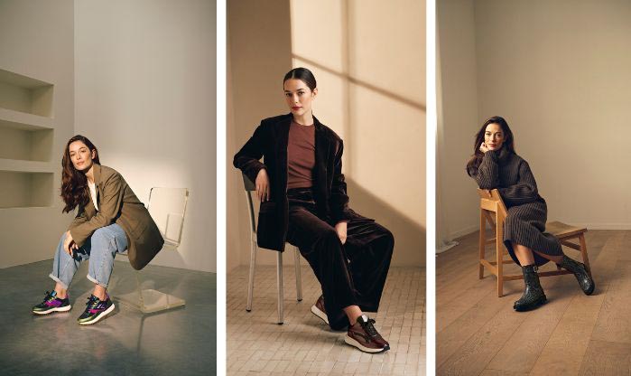 Twee dames in beige en groene kleding wijzend naar comfortabele schoenen